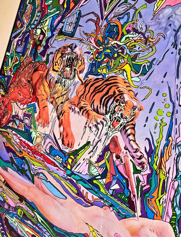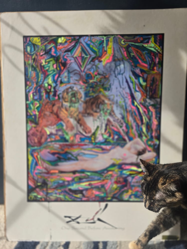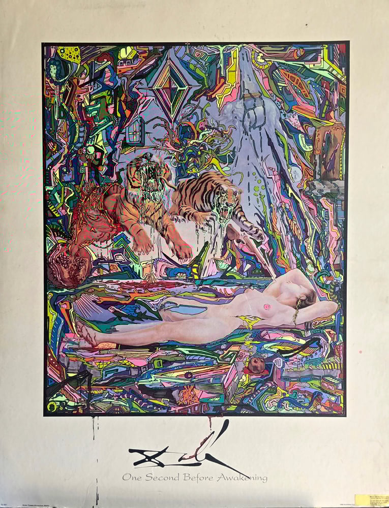 A discarded print, from the work of the ever eclectic master of surrealism, Dalí. This is a forced collab since he has no choice in the matter as I blasted colorful madness all over these Tigers and melting landscape, creating a psychedelic hellscape of the mind!